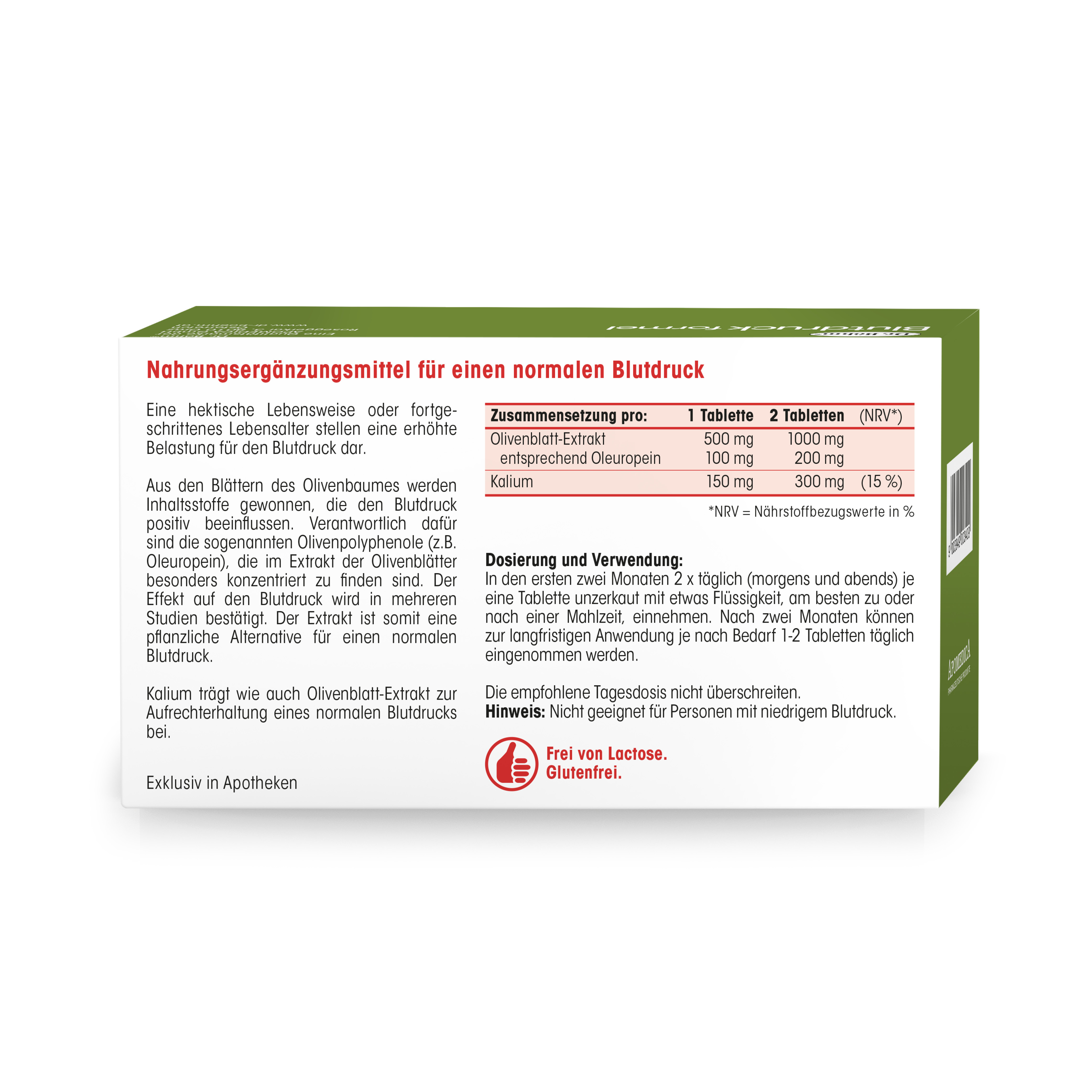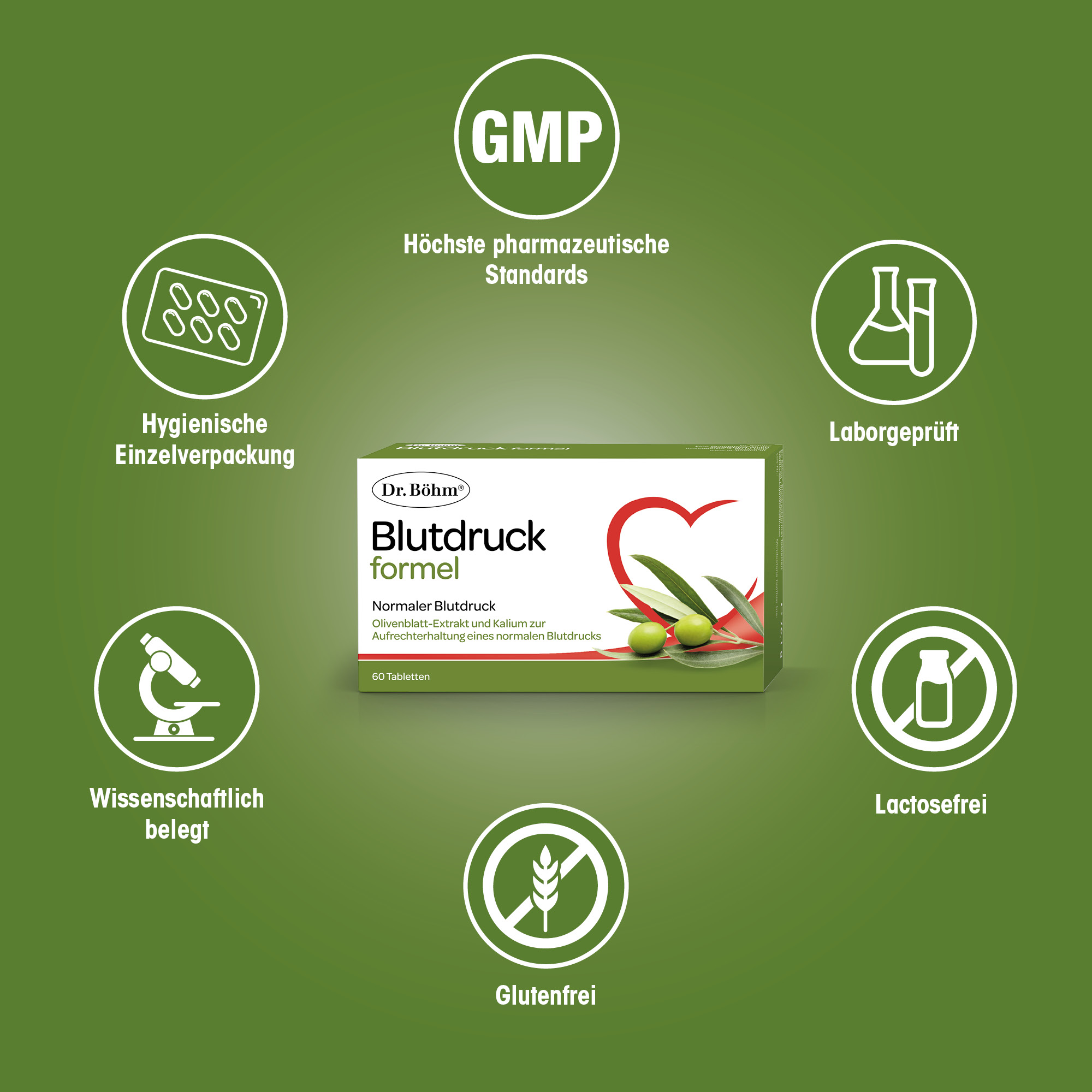 Dieses Wissen hat sich das Expertenteam von Dr. Böhm® zunutze gemacht und in der Dr. Böhm® Blutdruckformel einen hochkonzentrierten Olivenblatt-Extrakt zu einer leicht schluckbaren Tablette verarbeitet. Optimal abgerundet wird die Zusammensetzung mit dem Mineralstoff Kalium, der ebenfalls positiv auf den Blutdruck wirkt.
