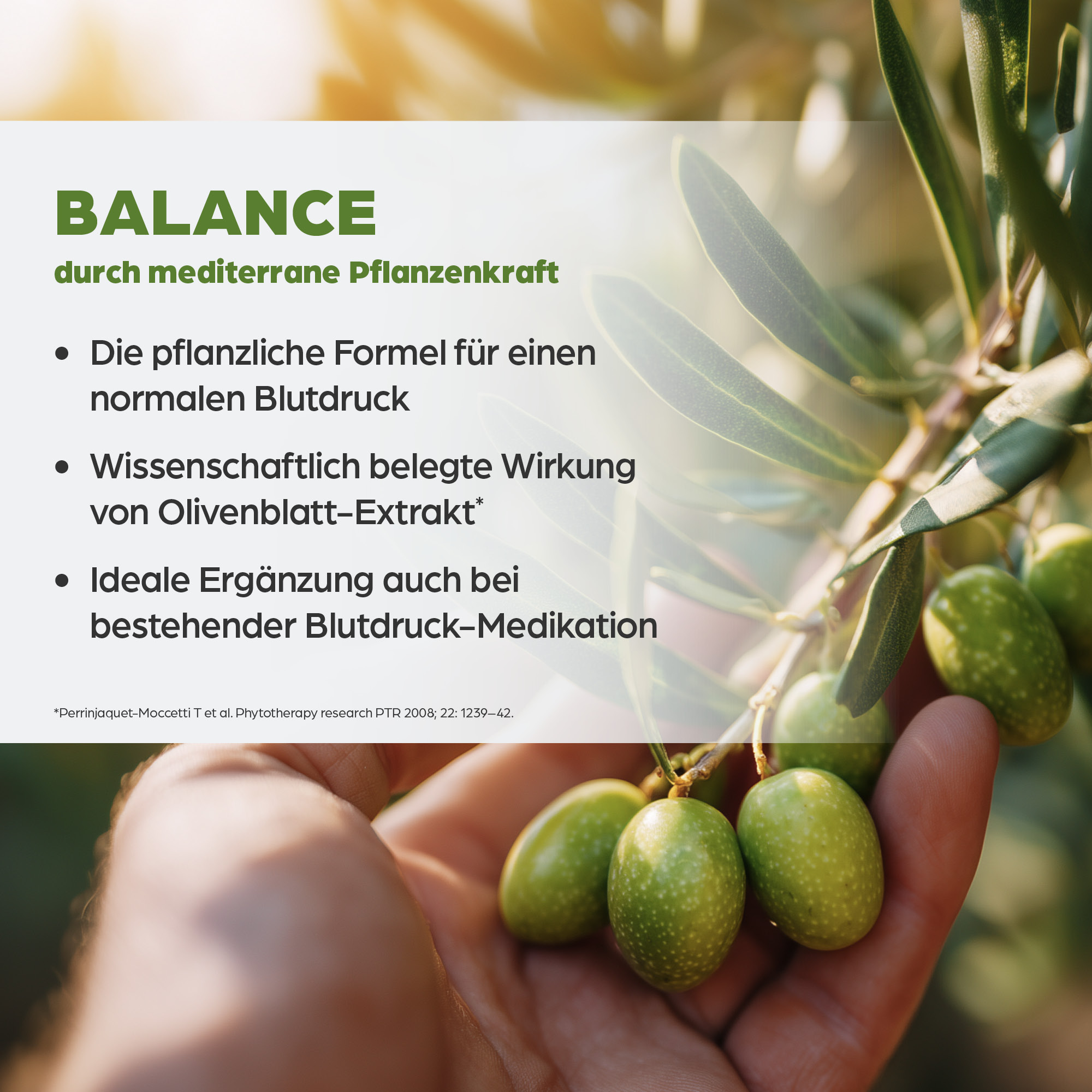 Wer zusätzlich etwas für einen normalen Blutdruck tun möchte, kann dabei auch auf pflanzliche Unterstützung zurückgreifen. Dass Olivenöl mit den darin enthaltenen Omega-9-Fettsäuren gut für das Herz-Kreislauf-System ist, wissen mittlerweile viele. Weniger bekannt ist, dass die in den Blättern des Olivenbaums enthaltenen Wirkstoffe einen positiven Effekt auf den Blutdruck haben. Wissenschaftliche Studien haben gezeigt, dass dieser schon nach 8 Wochen nachweisbar ist.
