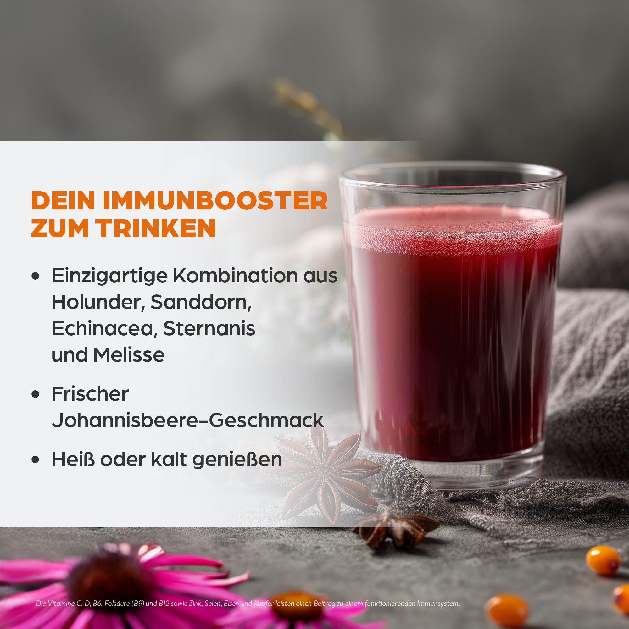- Einzigartige Kombination aus Holunder, Sanddorn, Echinacea, Sternanis und Melisse