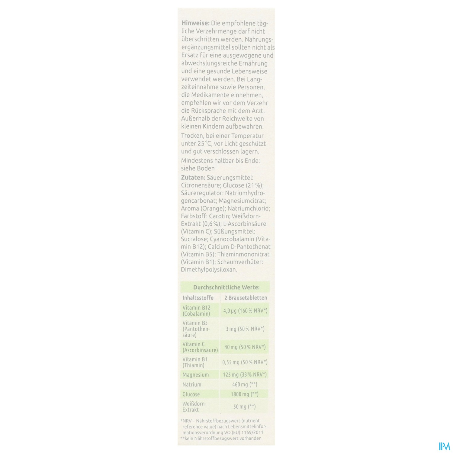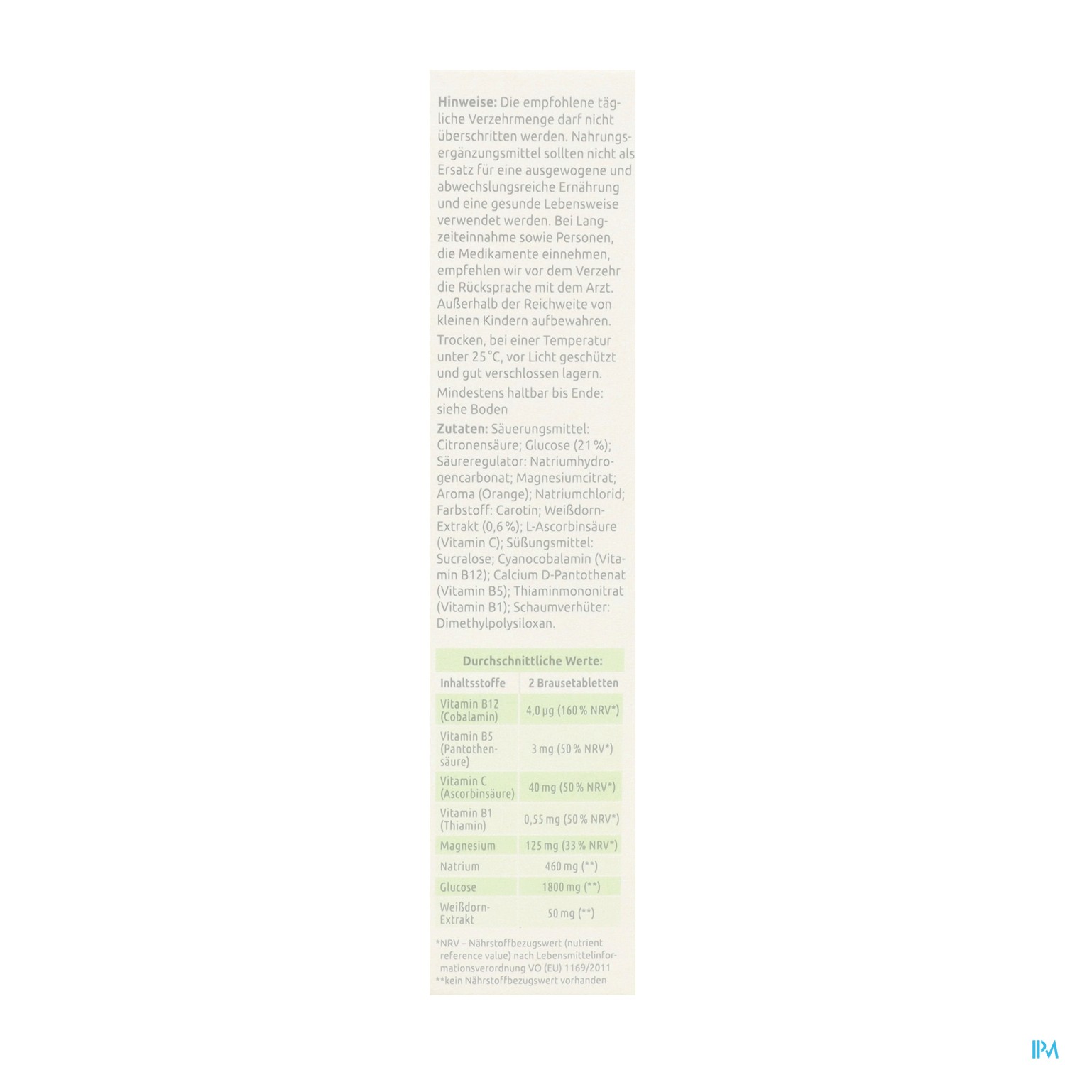 Glucose (31 %); Maltodextrin; Säuerungsmittel: Äpfelsäure; Natriumchlorid; Trikaliumcitrat; Magnesiumcit rat; Cholin-L-Bitartrat (2,7 %); Aroma; L-Ascorbinsäure (Vitamin C); Süßungsmittel: Sucralose; Nicotinamid (Niacin); Cyanoco balamin (Vitamin B12); Pyridoxinhydrochlorid (Vitamin B6); Farbstoff : Ribofl avin-5'-phosphat-Natrium.