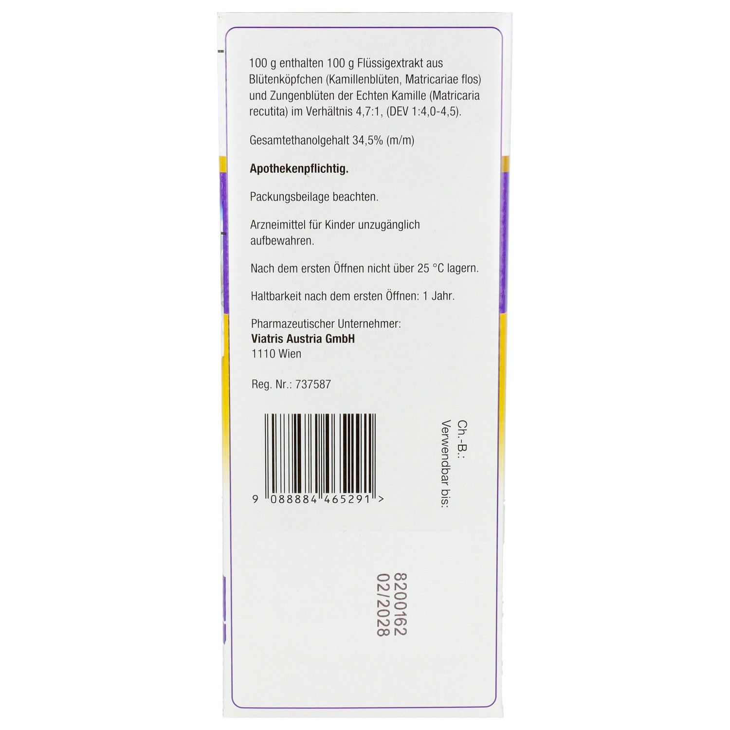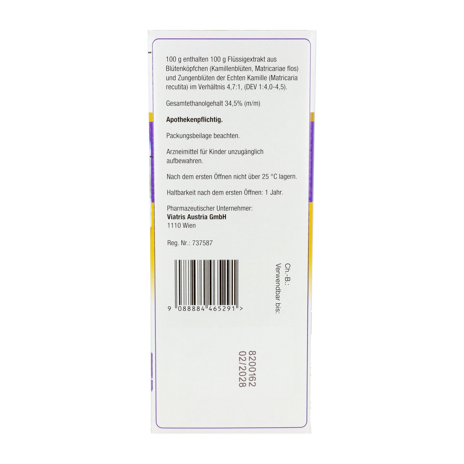 100 g enthalten 100 g Flüssigextrakt aus einer Mischung aus Blütenköpfchen (Kamillenblüten,